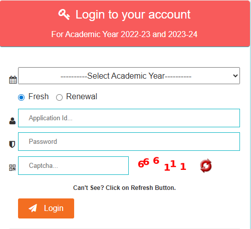 एनएसपी स्कॉलरशिप पोर्टल पर लोगिन करने के बाद आपको यहां पर आपका नाम एकेडमी केयर को सेलेक्ट करना है| इसके बाद आपको ऑप्शन को चुना है फ्रेशर/रिन्यूएबल है| इसके साथ ही आपको अपनी एप्लीकेशन आईडी को भरना है और में पासवर्ड को भरना है| कैप्चा कोड को भर देना है| इसके साथ ही आपको login के ऑप्शन पर क्लिक कर देना है|